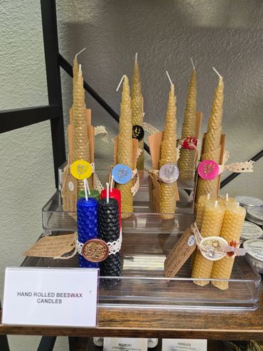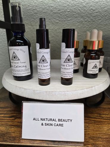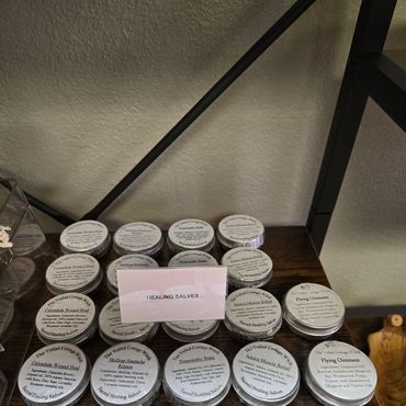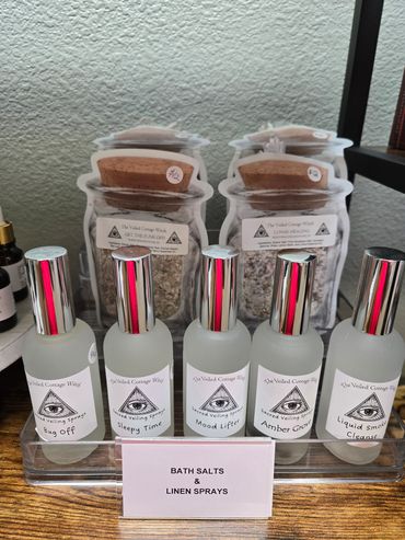 Holistic Healing Products crafted by Joey of The Veiled Cottage Witch, including healing salves, bath salts, linen sprays, all-natural beauty and skin care, hand-rolled beeswax candles, hand-tied smoke bundles, and a variety of tinctures.